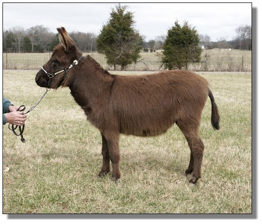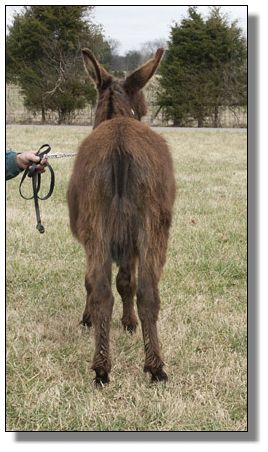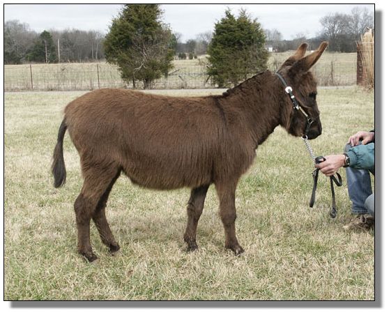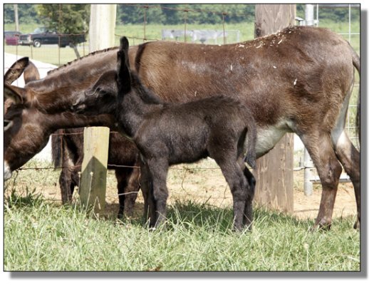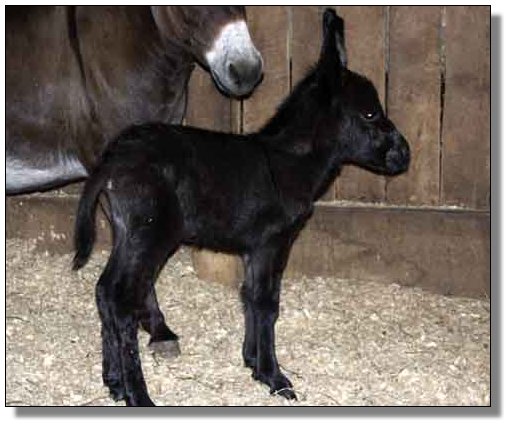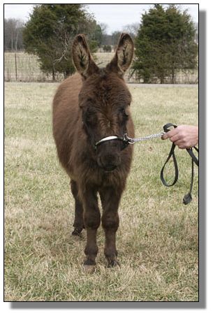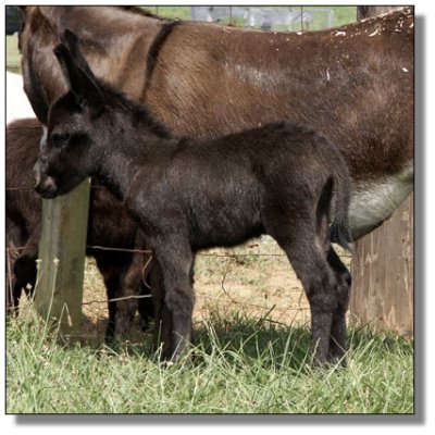 Charm's dam, My World Holly, was purchased in partners with one of my very dearest friends, Mary Hubbard. Holly was in foal and Mary was to get Holly and I was to get the baby. Of course, we were hoping for a jennet. Holly foaled a nice little dark brown jack that year. Mary insisted that I keep Holly and try again. This time we bred her to our little jack, Pepper. Once again Holly foaled a dark brown jack..this one we named Chaps, My Ass! Mary talked me into trying one last time...this time no matter what the outcome I was sending her jennet home and this time we bred her to our spotted herd sire, Indy. Of course I was praying for a spotted jannet but we never dreamed that she would foal a dark no light points jennet and we are thrilled. Thanks to Brasstown Brayers Farm for naming this perfect little girl.