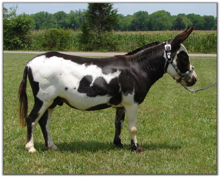 is our spotted herd sire. He is a heavy-boned, compact jack with a tiny, short head, heavy