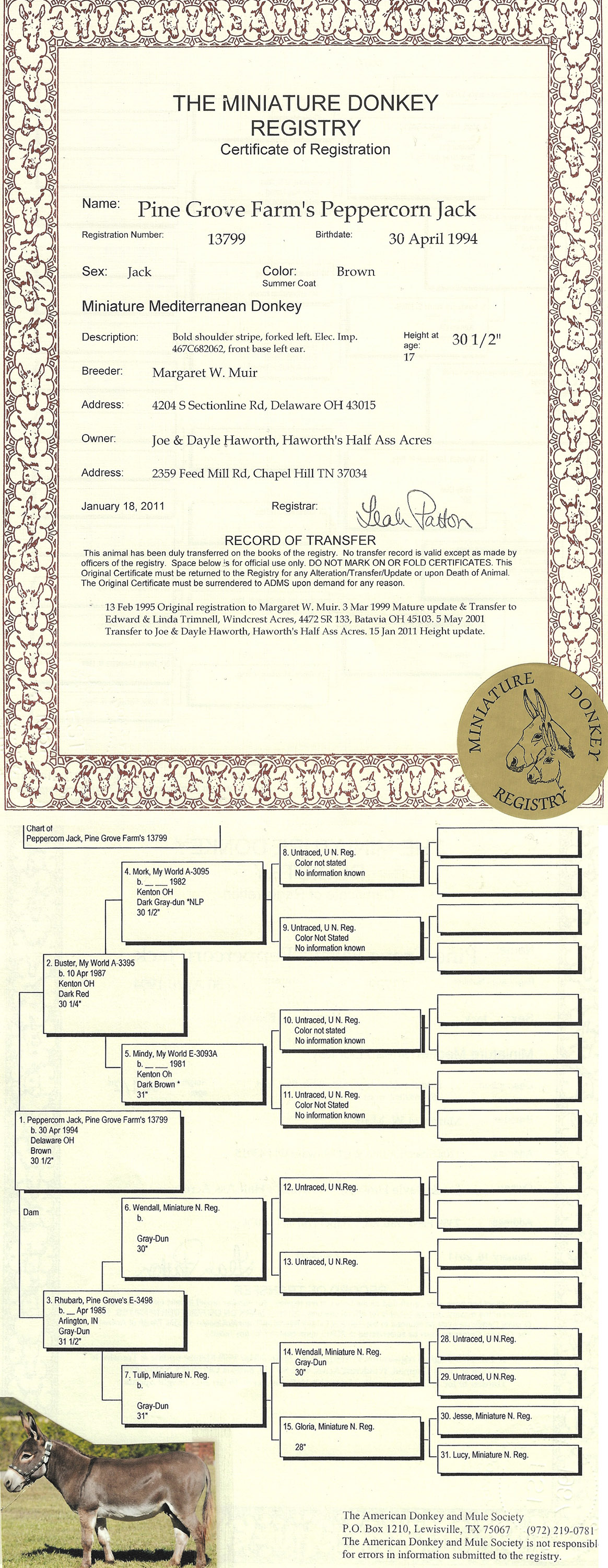 Rojo has just arrived and we absolutely love this fine looking, well-mannered jack. We jumped at the chance to own this Heiken's Ark Top Gun great grandson when we heard he was for sale because we needed to add taller donkeys into our herd. We had sold all of our taller donkeys when we did not show for a period of three years. Now that we are back on the show circuit sometimes our tiny donkeys get overlooked by the judges. We are thrilled to add Rojo's bloodlines into our herd. We think he will cross great with our Bruise and Zoo daughters and produce well-mannered, trainable show donkeys that will catch the judge's eyes. Rojo's pedigree is completely full with no unknowns.