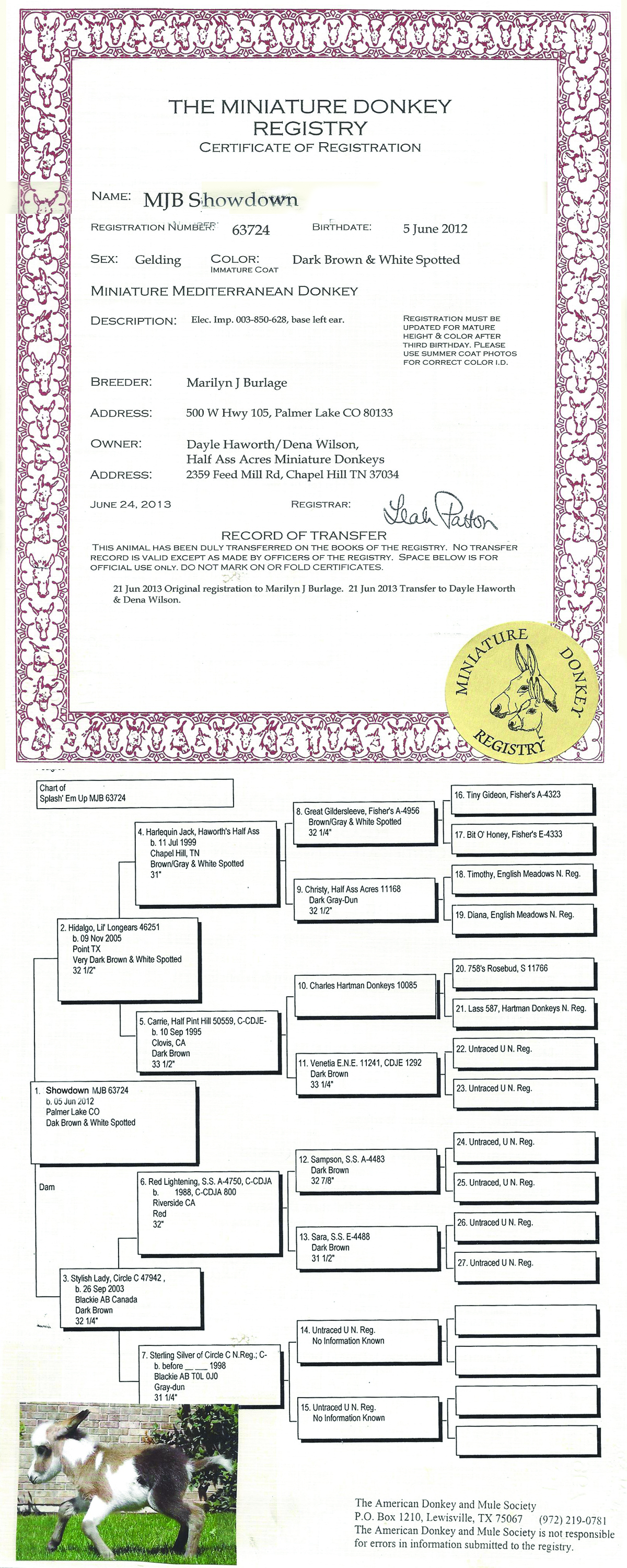 Click MDR sign for Miniature Donkey Registry Pedigree Showdown's pedigree!