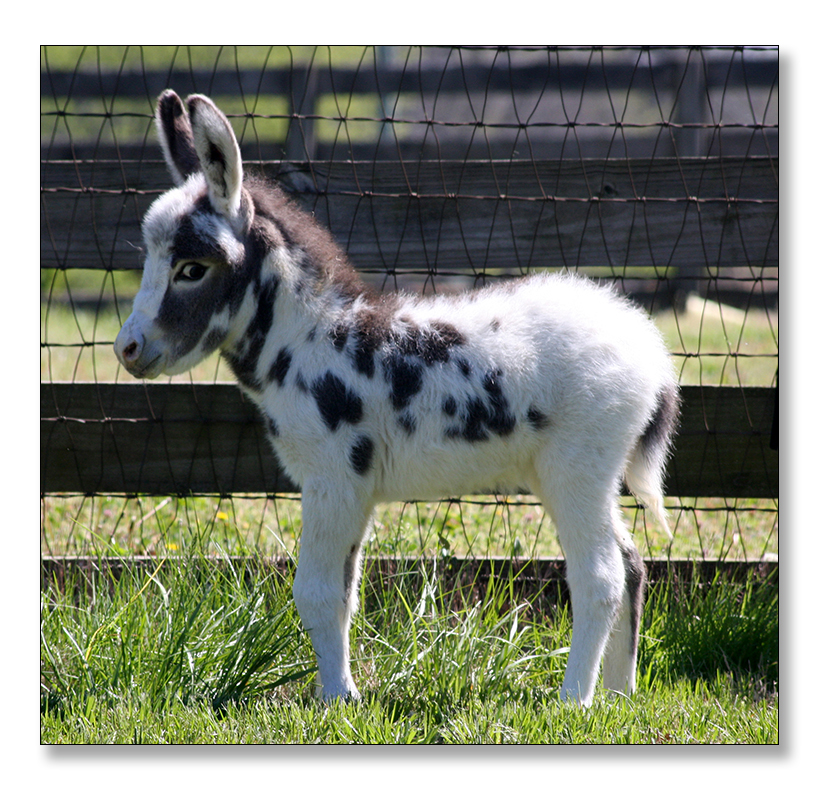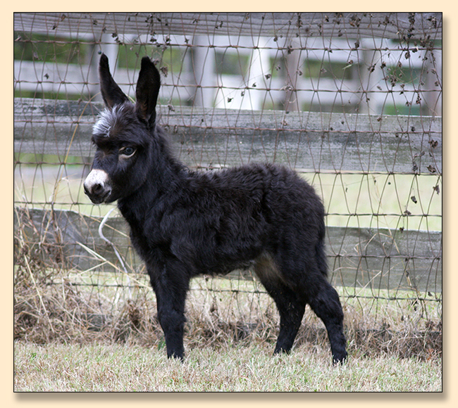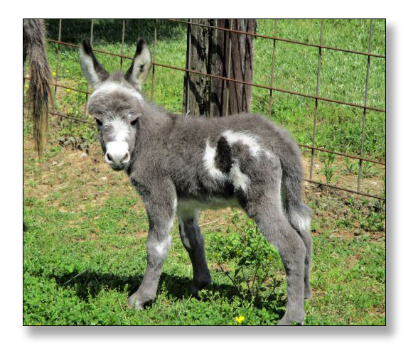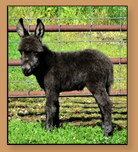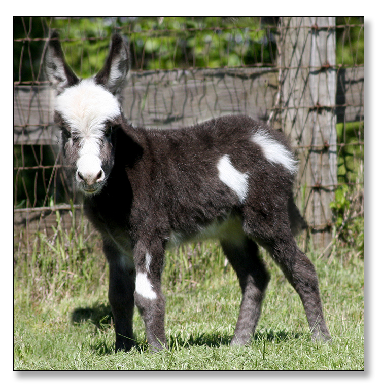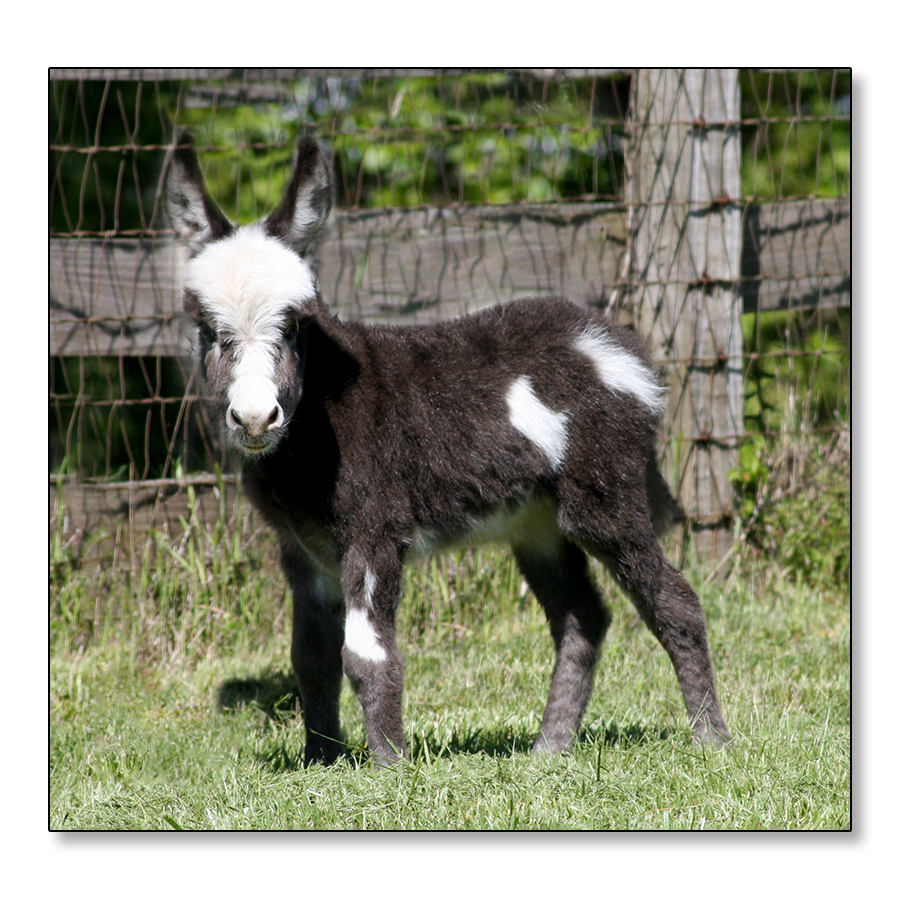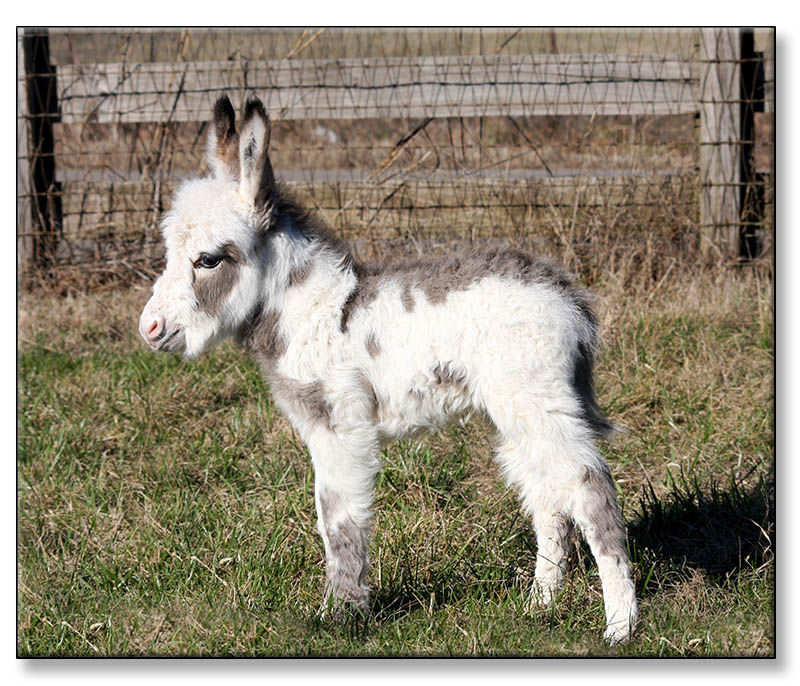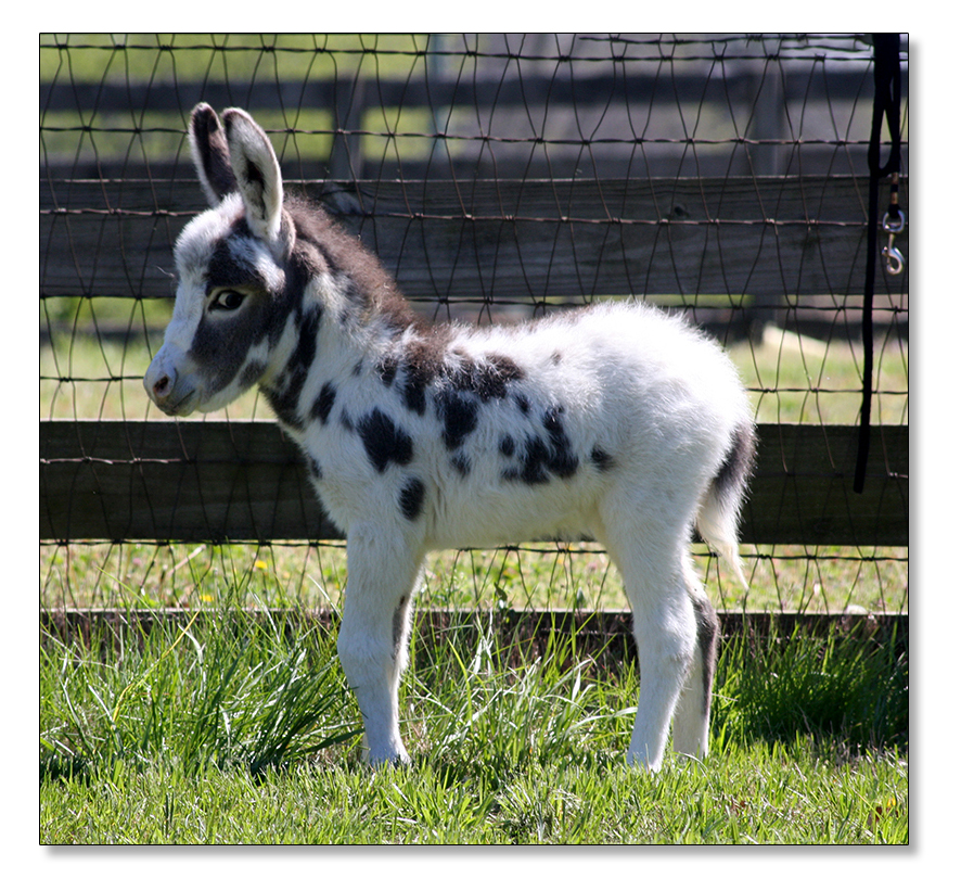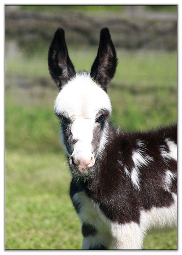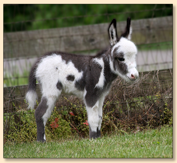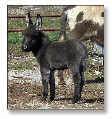 Macho looks like he will make a spectacular herdsire at maturity.  We think that when he loses his foal coat he may be a black and white like his dam. He is very stocky with straight legs and a perfect bite. He will be up to date on all vaccinations including Eastern/Western Encepelitis, Tetanus, Rhino, Influenza, West Nile and Rabies. His hooves and deworming will be up to date. He will have a negative coggins report and a health certificate if sold out of state. He will also be double registered in The Miniature Donkey Registry and The American Council of Spotted Asses. Payments will be fine until he is weaned at five to six months of age. Or you can purchase him with his dam and enjoy Macho now while he is a baby.