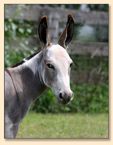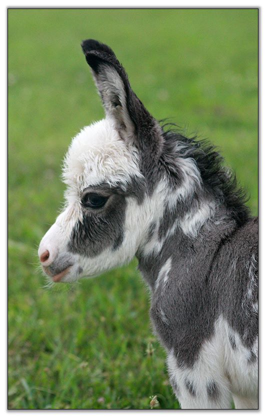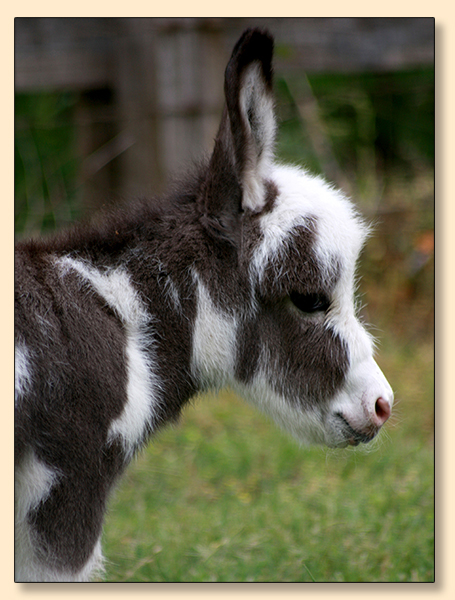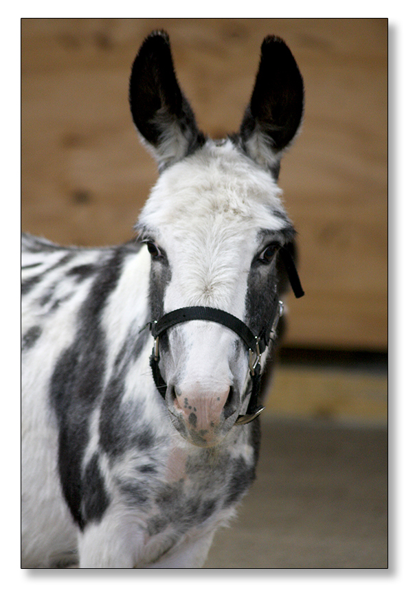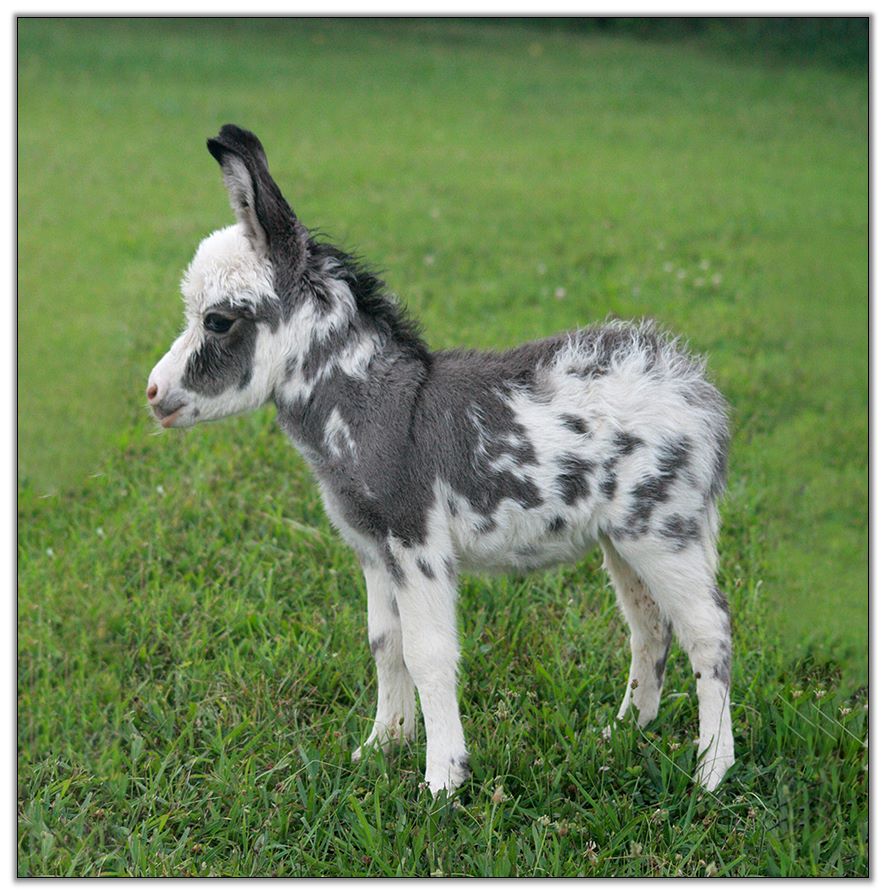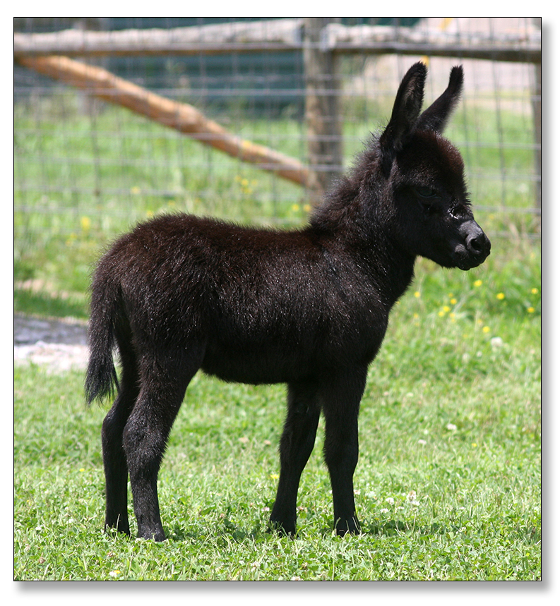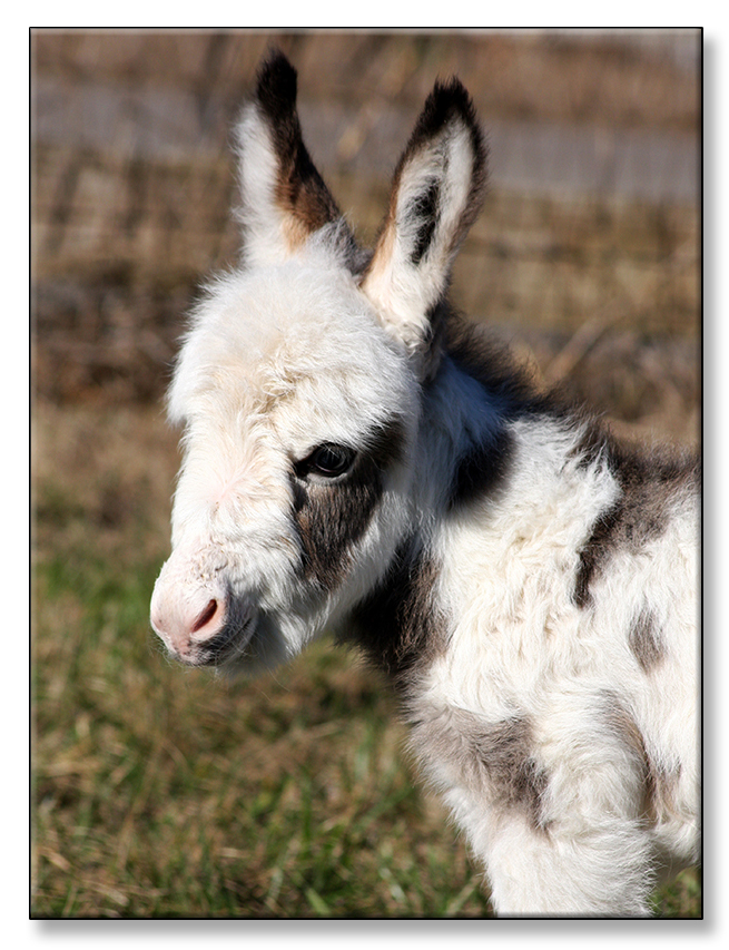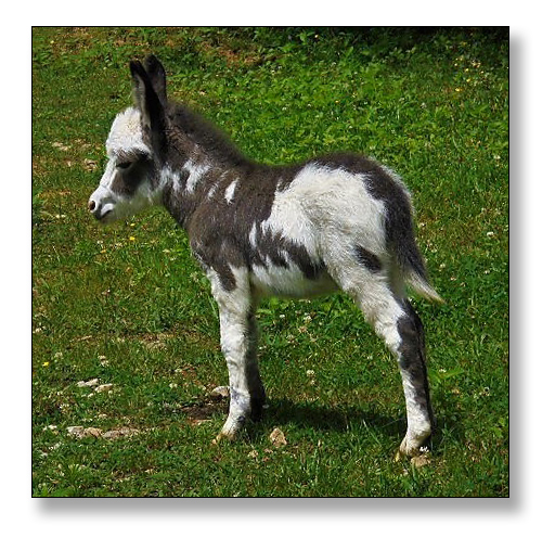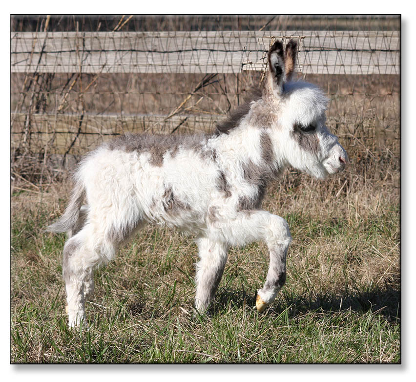 Macho looks like he will make a spectacular herdsire at maturity.  We think that when he loses his foal coat he may be a black and white like his dam. He is very stocky with straight legs and a perfect bite. He will be up to date on all vaccinations including Eastern/Western Encepelitis, Tetanus, Rhino, Influenza, West Nile and Rabies. His hooves and deworming will be up to date. He will have a negative coggins report and a health certificate if sold out of state. He will also be double registered in The Miniature Donkey Registry and The American Council of Spotted Asses. Payments will be fine until he is weaned at five to six months of age. Or you can purchase him with his dam and enjoy Macho now while he is a baby.