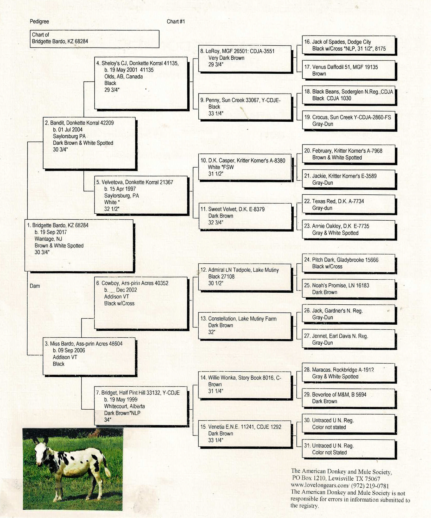 Click MDR sign for Miniature Donkey Registry Pedigree Bridgette's complete pedigree!